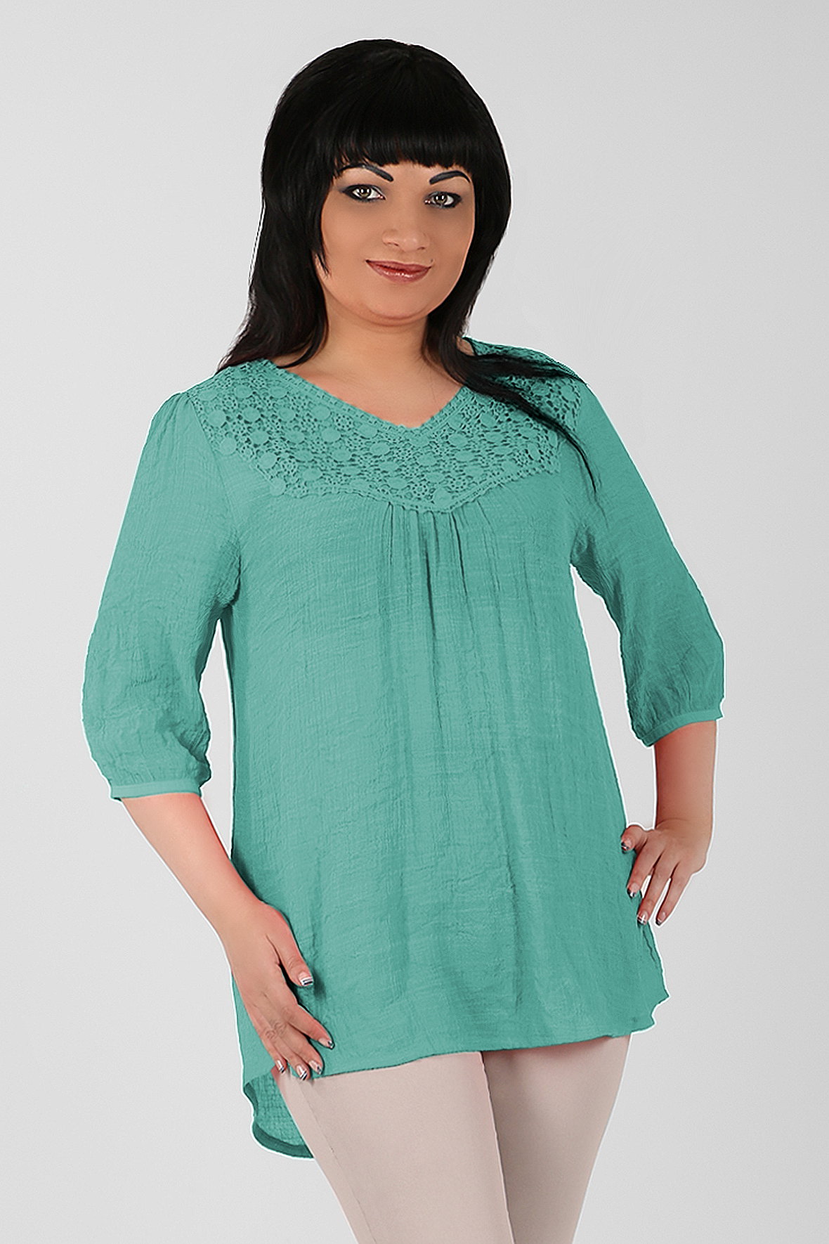 Женская туника свободного покроя из легкой нежной ткани , без застежки, украшена кружевом в тон ткани, передняя полочка короче примерно на 8см, прекрасно сочетается с летними брюками и капри, идеальна для жаркого времени года