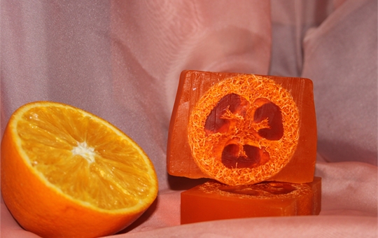 Ярко-оранжевое мыло с люфой и натуральным эфирным маслом апельсина создает ощущение, что перед тобой находится только что сорванный с ветви дерева фрукт.