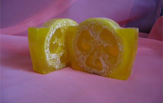 Золотисто-желтое мыло ручной работы с люфой с пробуждающим ароматом кисло-сладкого лимона.