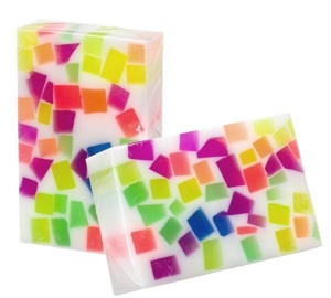 Ослепляющее мыло цвета белой лилии с разноцветными кубиками со сладким ароматом печенья.