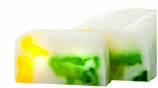 Светло-кремовое мыло с прозрачными желтыми и изумрудными разводами и с освежающим запахом зеленого чая.