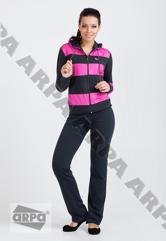 Костюм для спорта и отдыха из высококачественного трикотажного полотна. Куртка с капюшоном отделана элементами из водоотталкивающей ткани как в тон куртки, так и контрастных ярких цветов. Боковые карманы на молнии. На задней части брюк имеется кокетка. Состав: хлопок - 80%, полиэстер - 14%, эластан (лайкра) - 6%.